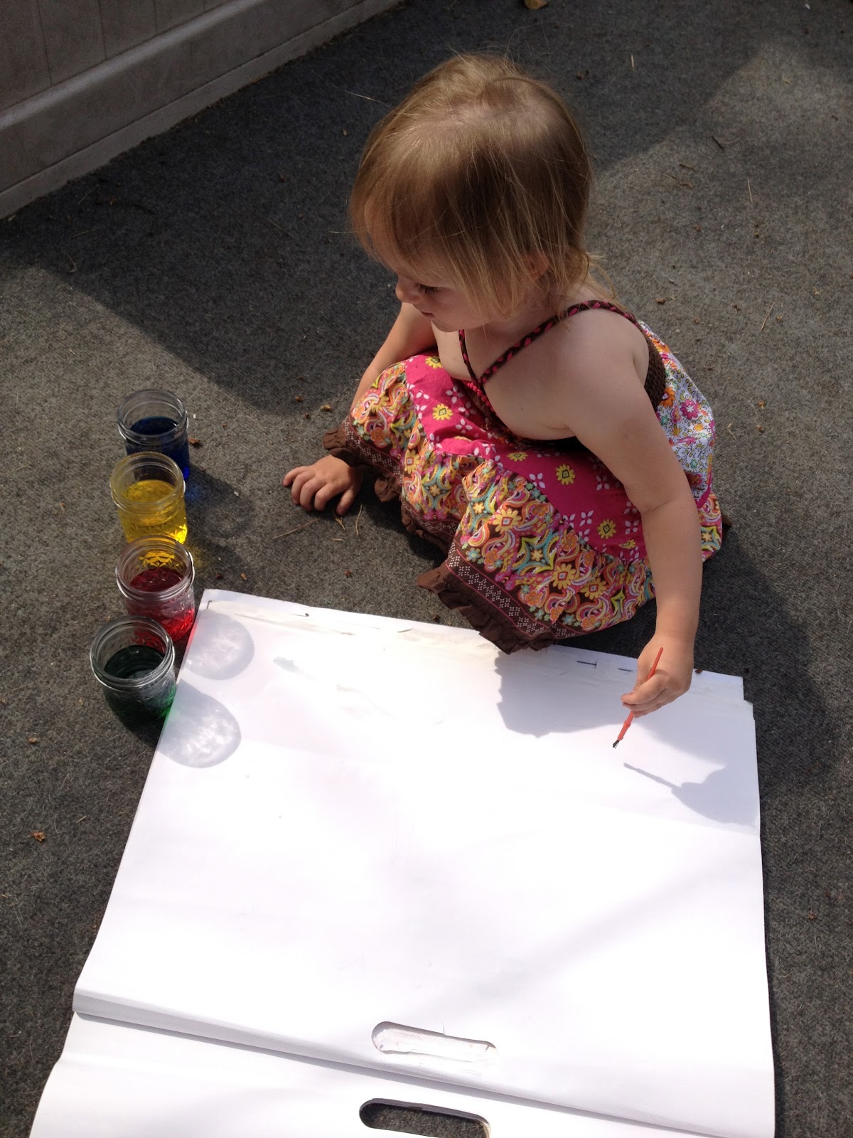 I finally got Harper into the tub and showed her what she could do with the brush and "paint" when I then thought, "Uh oh! What if this stains the tile? Or the tub?" and in a very not-so-great parenting moment I washed off part of Harper's "painting" just to make sure. Thankfully, no damage was done.