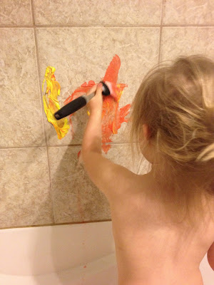 I finally got Harper into the tub and showed her what she could do with the brush and "paint" when I then thought, "Uh oh! What if this stains the tile? Or the tub?" and in a very not-so-great parenting moment I washed off part of Harper's "painting" just to make sure. Thankfully, no damage was done.